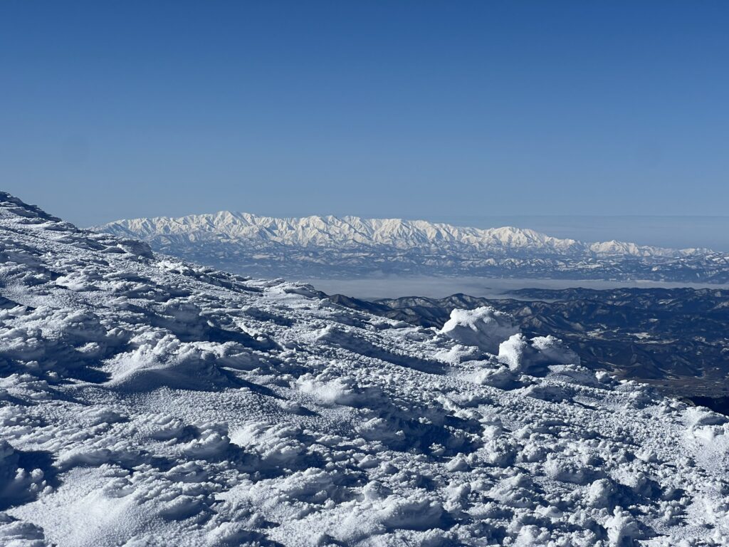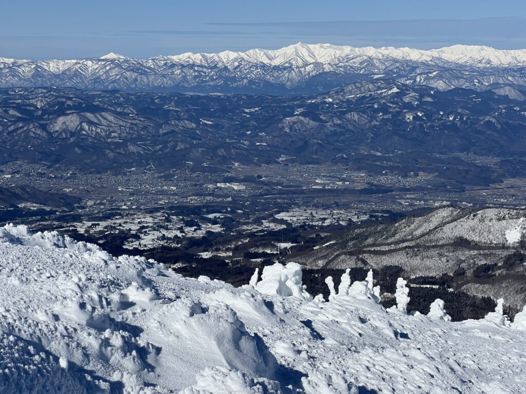 西に目を転ずると、形の良い鳥海山、そして南側には月山、朝日岳、飯豊山が見えます。飯豊山の南側には、うっすら遠くに山影が見えます。どうも、尾瀬の山、167km向こうの燧岳が見えているようです。厳冬期にこの展望はなかなかお目にかかれないのではないでしょうか。