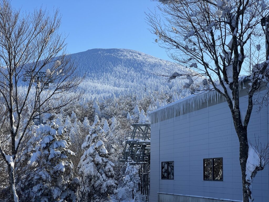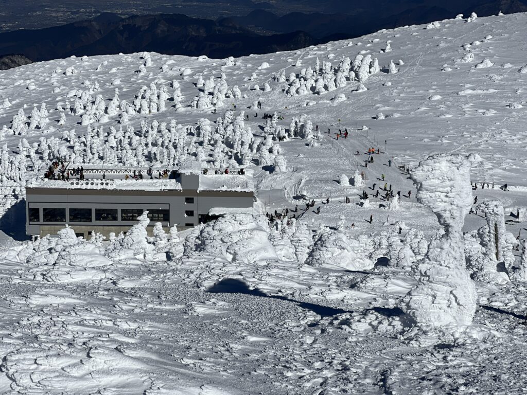 中間駅でゴンドラに乗り換えます。中間駅の様子。上部の地蔵岳と思しき山腹には、真っ白い木々が見えます。樹氷かな?期待が高まります。